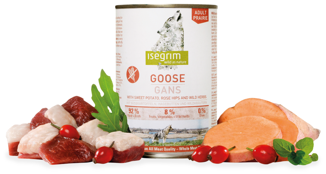Meat and animal derivatives (33 % goose, 30 % poultry), broth (29 %), vegetable (3,8 % sweet potatoe), fruits (3 % rose hips), minerals (1 %), herbals (0,1 %), oils and fats (0,1 % salmon oil).