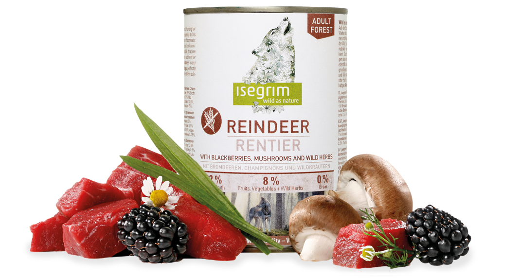 Meat and animal derivatives (63 % reindeer), broth (29 %), fruits (3,8 % blackberries), mushrooms (3 % white mushrooms), minerals (1 %), herbals (0,1 %), oils and fats (0,1 % salmon oil).