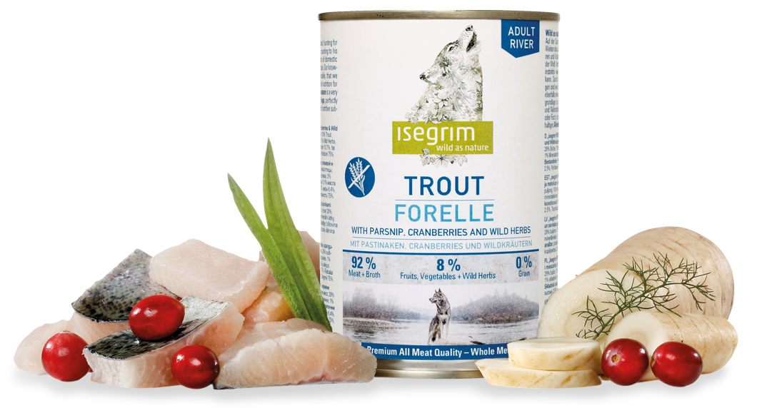 Delicious trout combined with fresh poultry meat provides lots of proteins and good energy. The addition of parsnip & cranberries which are rich in vitamin c plus a special mix of wild herbs makes isegrim® Trout to a tasty menu which reflects the balanced feeding in the natural habitat of the wolf.